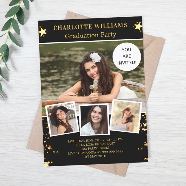 Black gold stars photo graduation party invitation | Zazzle