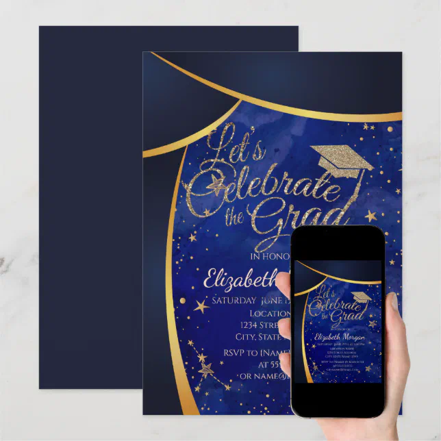 Gold Stars Graduation Cap Navy Blue Graduation Invitation | Zazzle.com ...