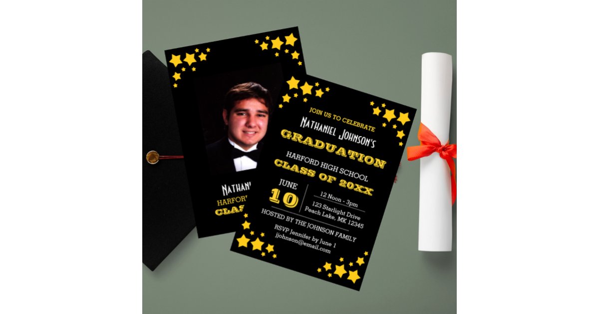 Gold Stars Black Graduation Invitation | Zazzle