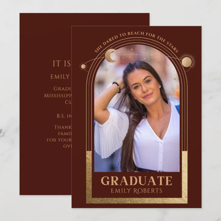 Graduation Red Gold Sun Moon Stars Grad Photo Invitation | Zazzle