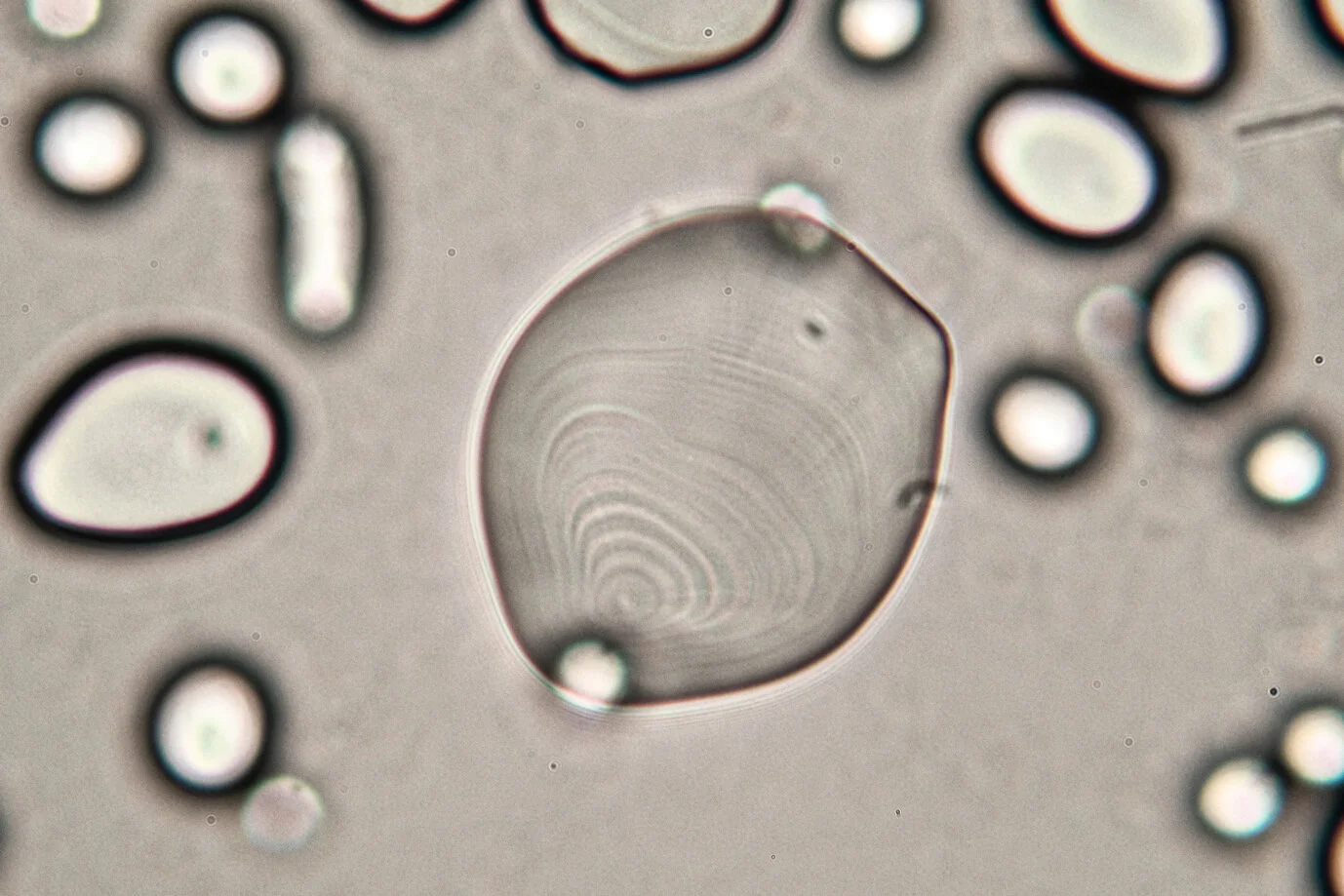 Starch grains of potato under microscope. 1000x magnification. Sample ...