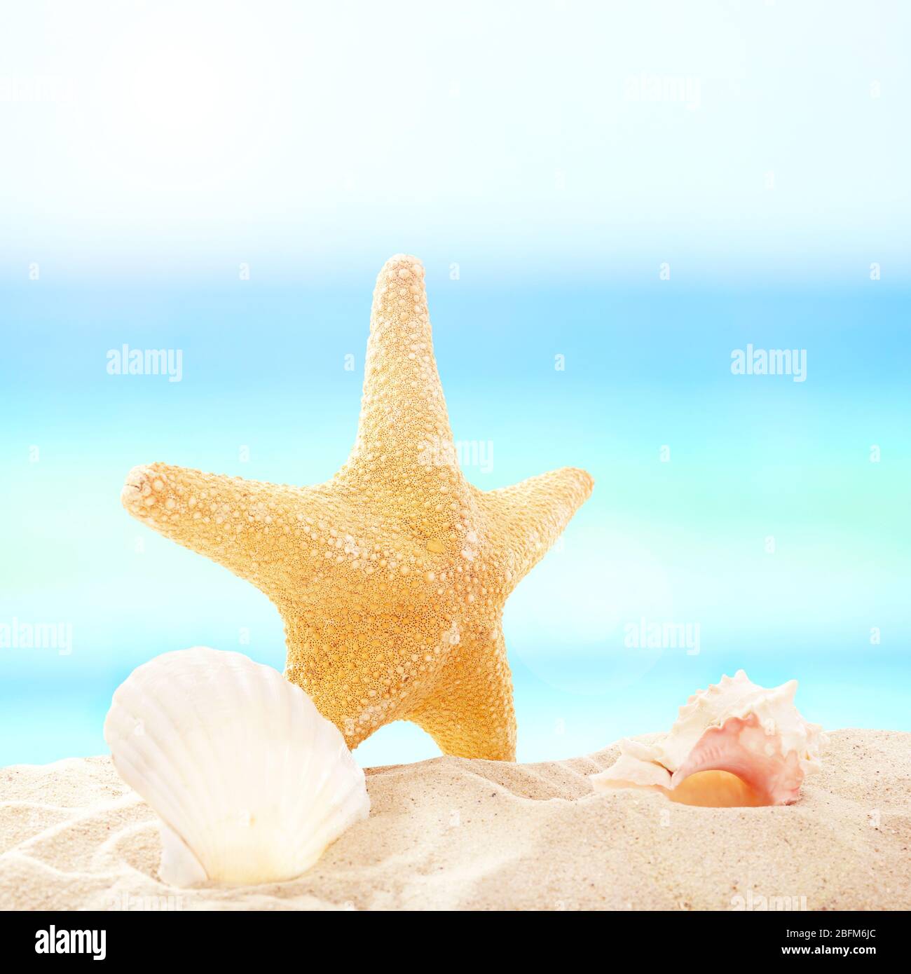 Beautiful starfish with seashells on beach sand Stock Photo - Alamy