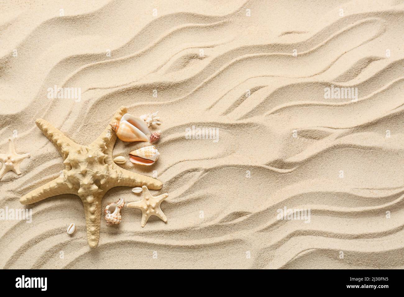 starfish and shells on the beach sand background Stock Photo - Alamy