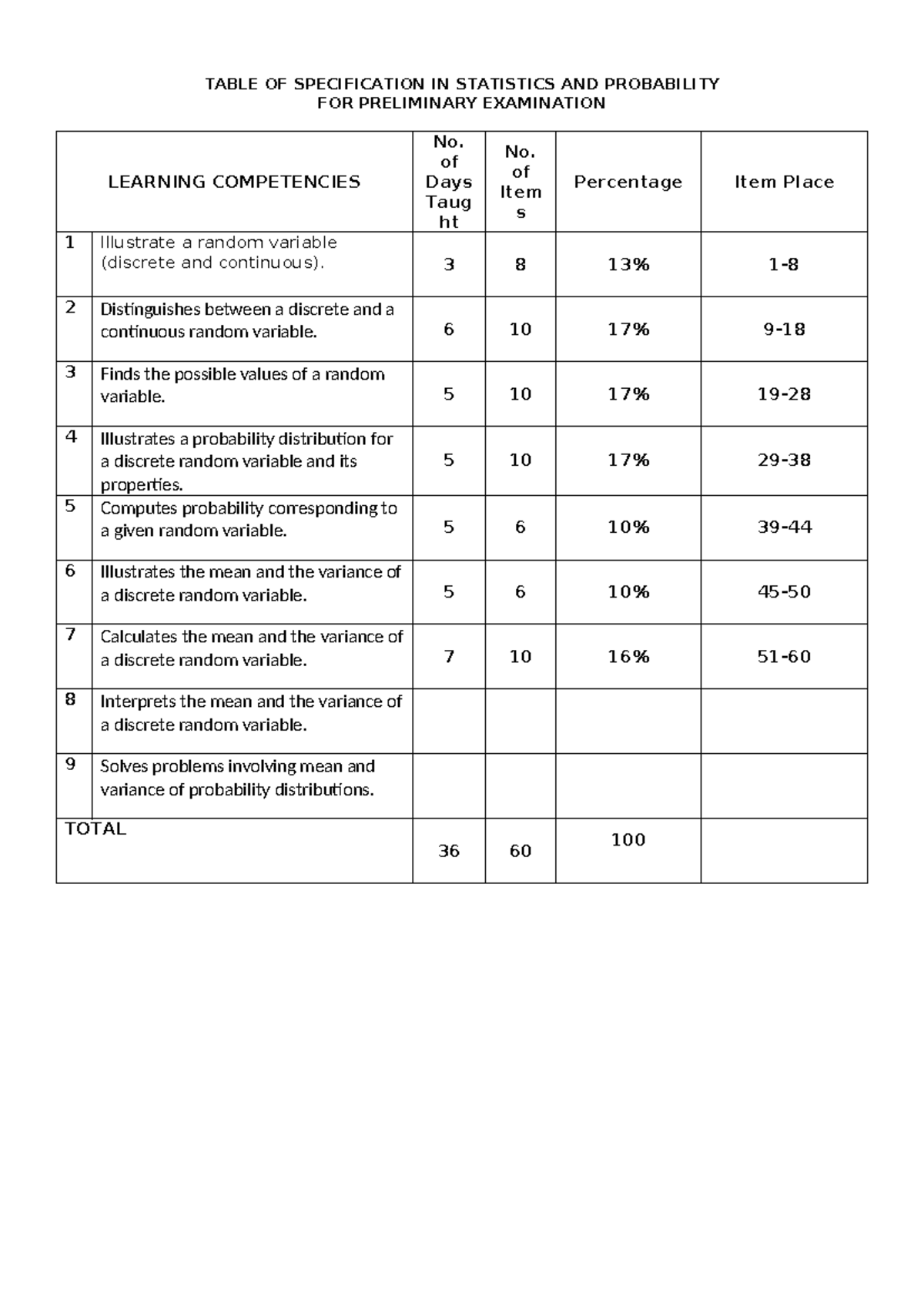 TOS STAT - Table of Specification for Preliminary Exam in Statistics ...