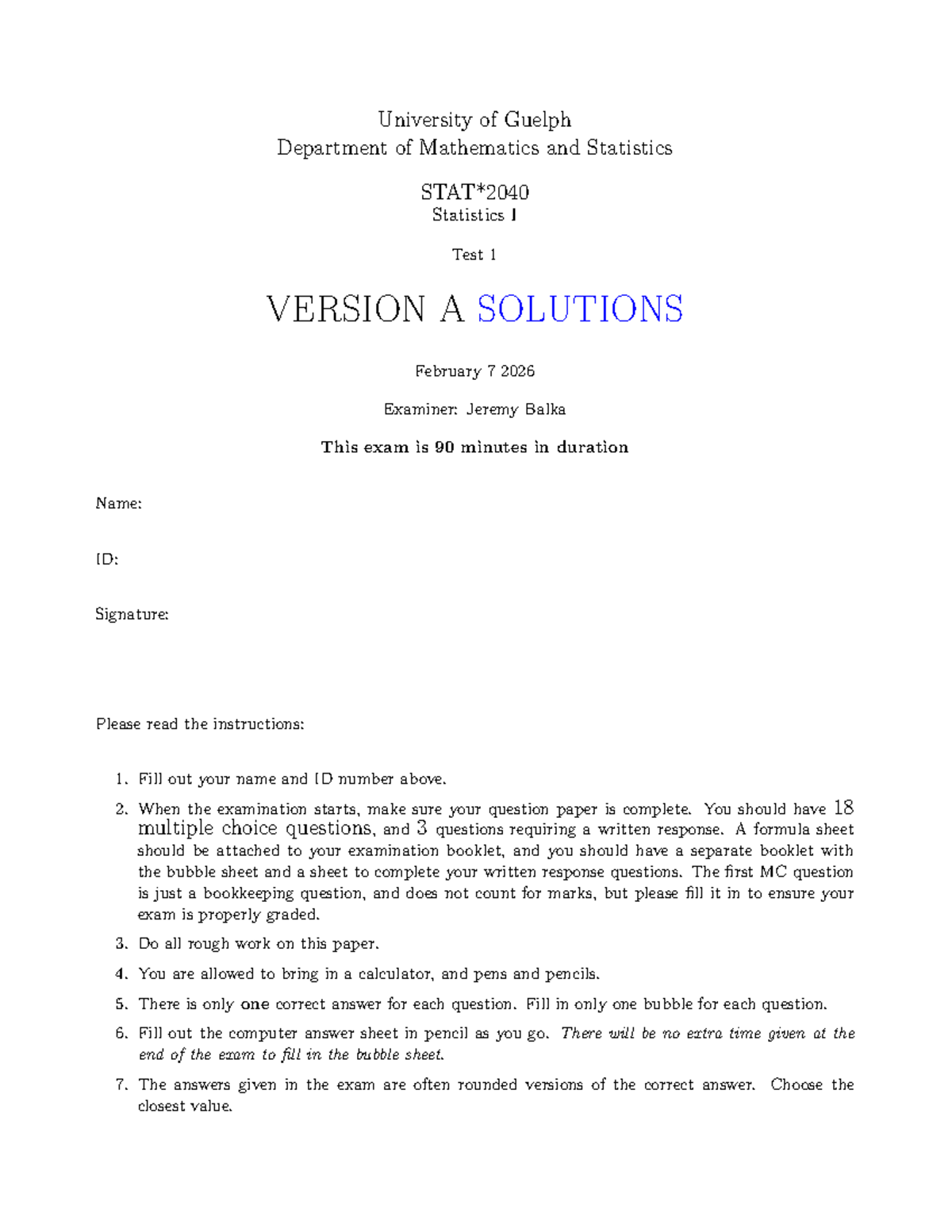 Statistics I Test 1 (W26 T1) Version A Solutions - Feb 2026 - Studocu