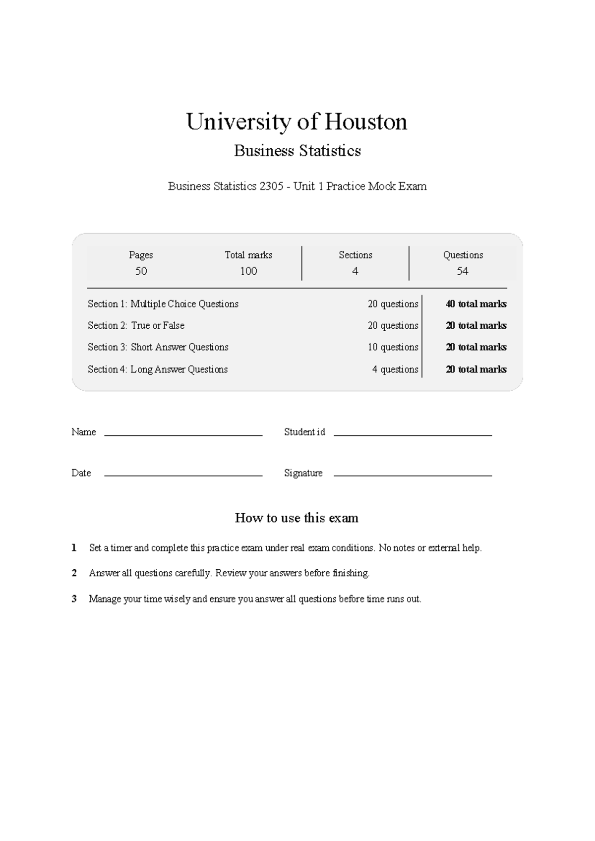 BUSI2305 Business Statistics Unit 1 Mock Exam Practice 2026 - Studocu