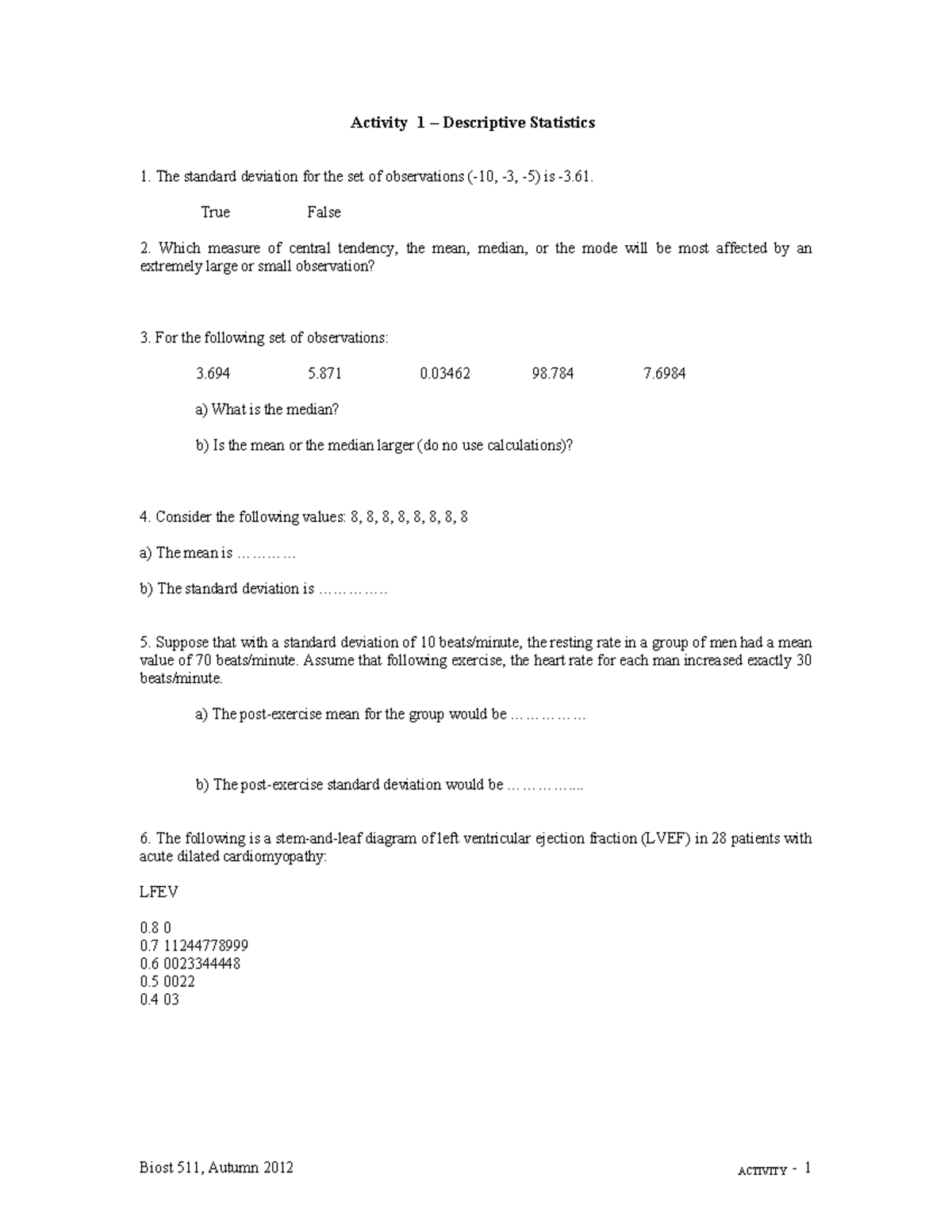 Biost 511: Activity 1 - Descriptive Statistics Overview - Studocu