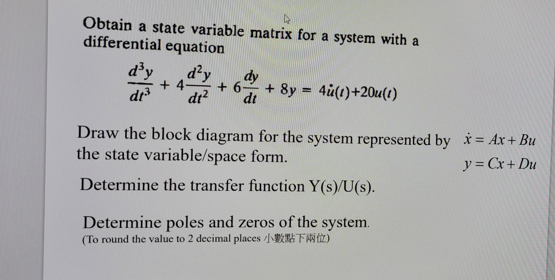 Solved Obtain a state variable matrix for a system with a | Chegg.com