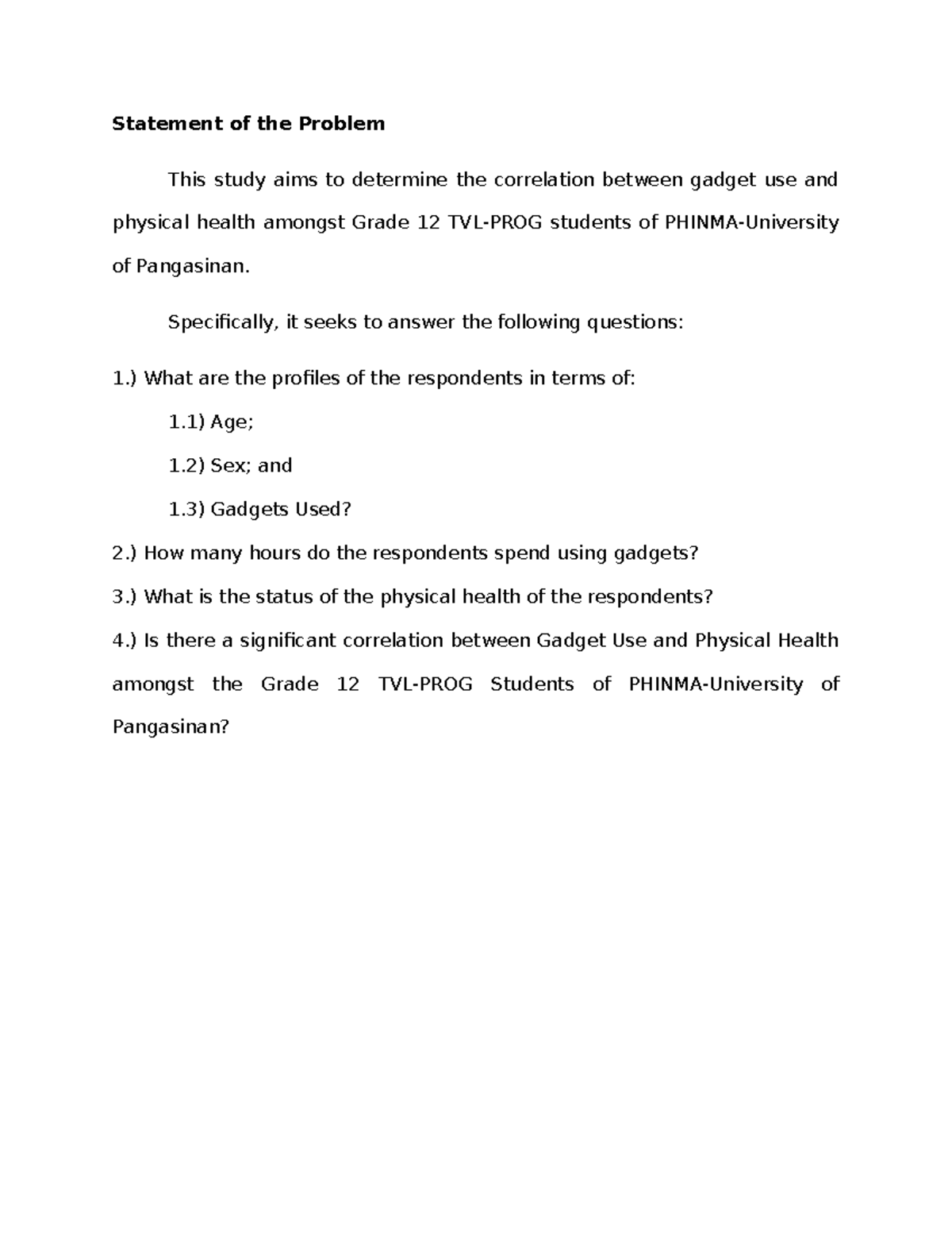 Sample- Questionnaire-2 - Statement of the Problem This study aims to ...