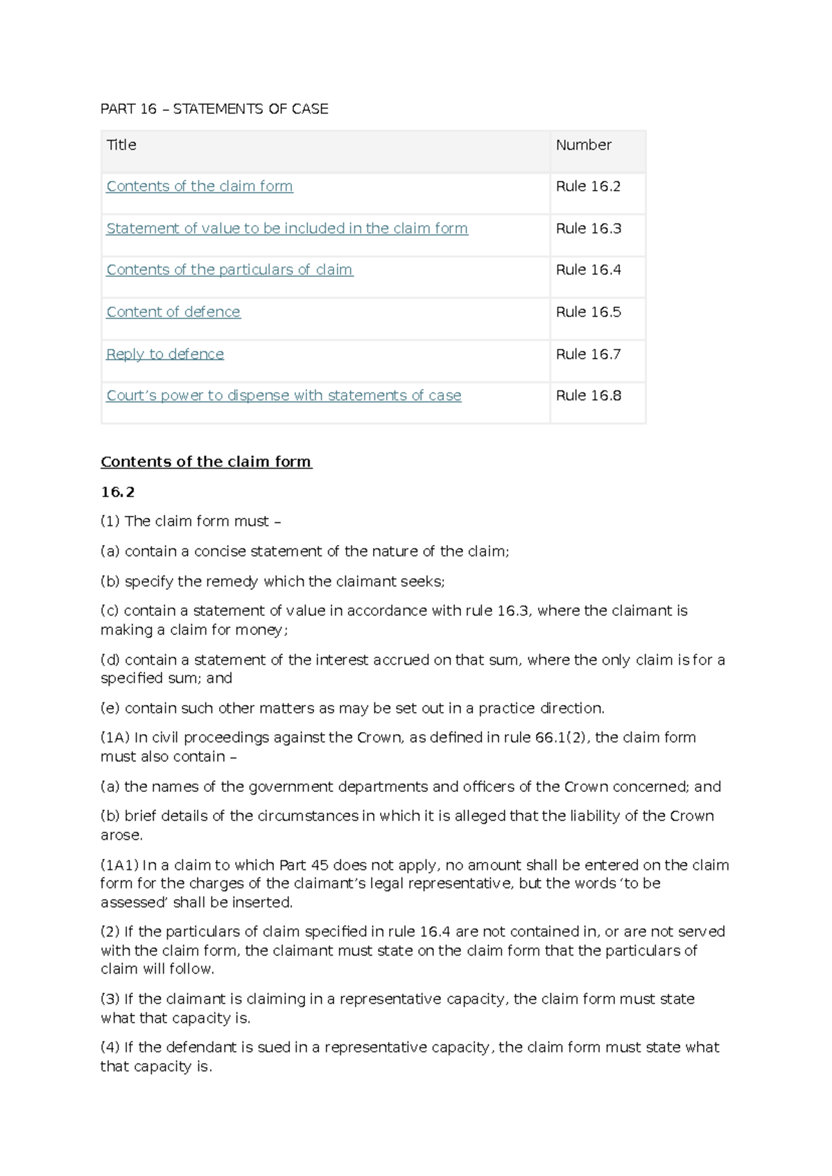 Part 16: Statements of Case - Claim Form Rules & Requirements - Studocu