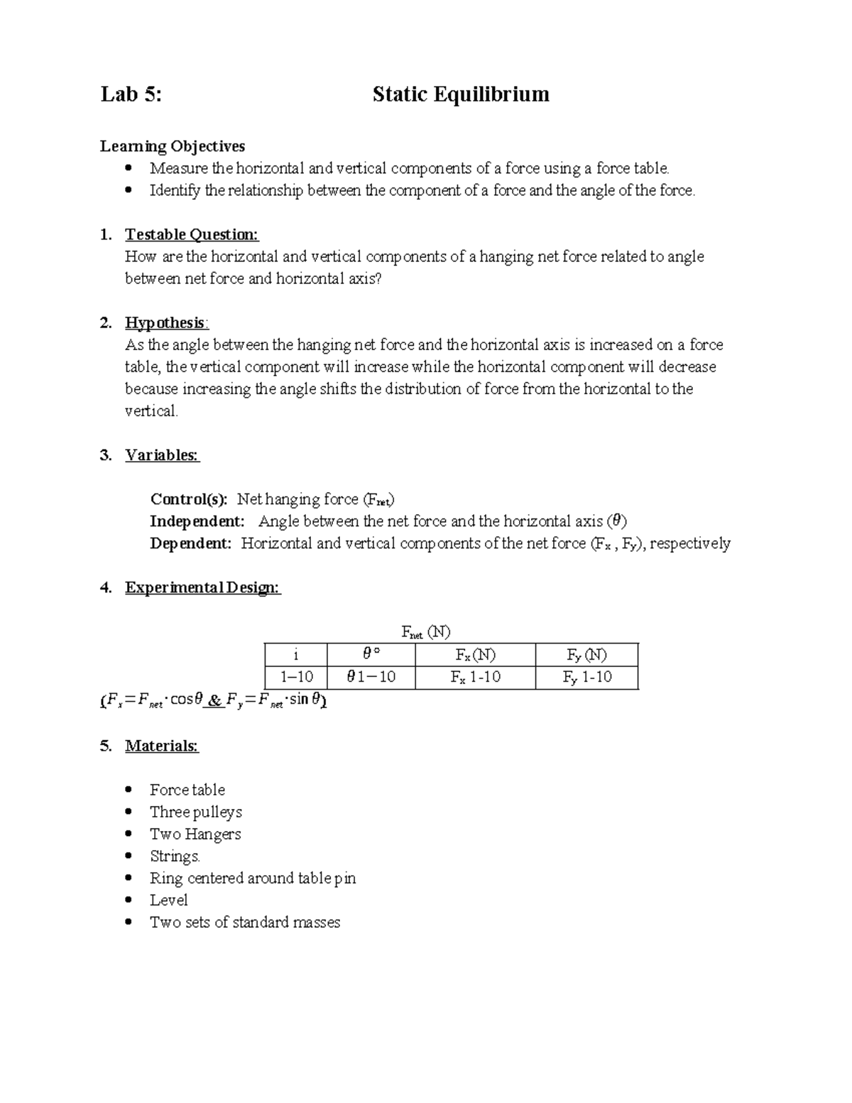 Lab 5: Static Equilibrium Analysis and Force Component Relationships ...