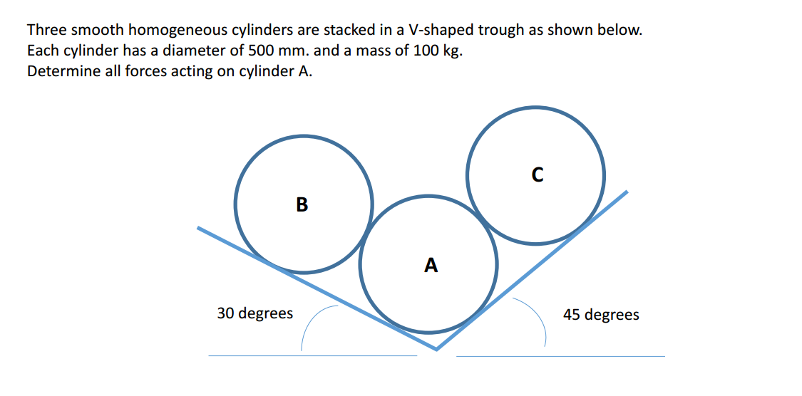Three smooth homogeneous cylinders A, B, and C are stacked in a V-shaped