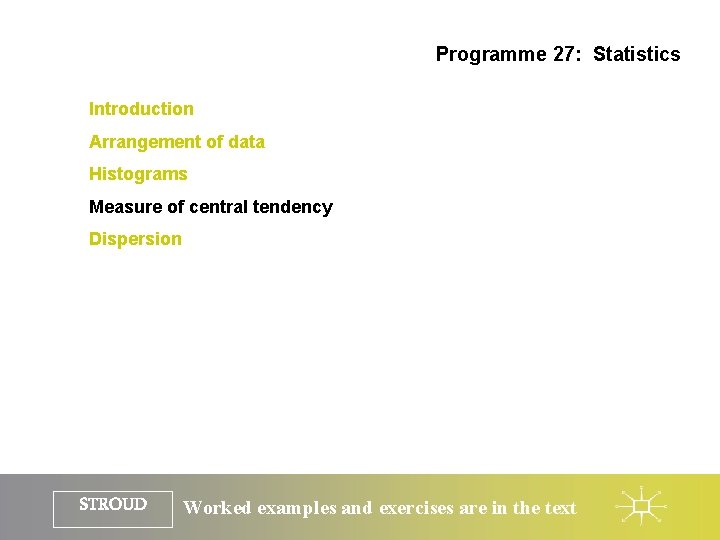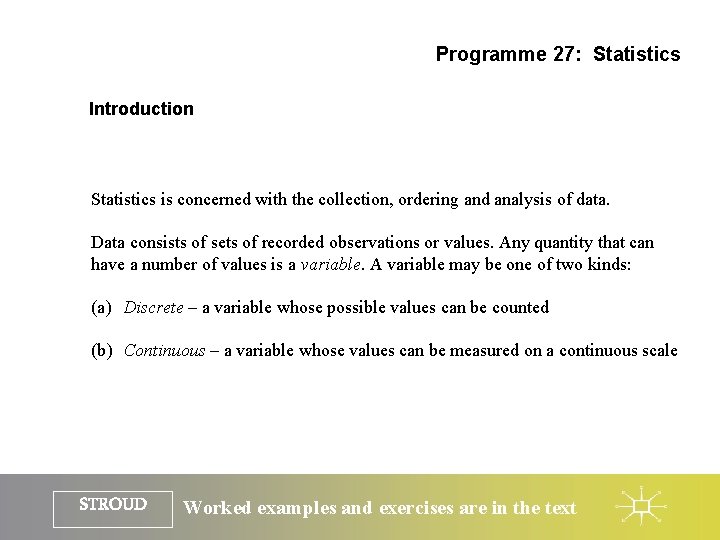 PROGRAMME 27 STATISTICS STROUD Worked examples and exercises