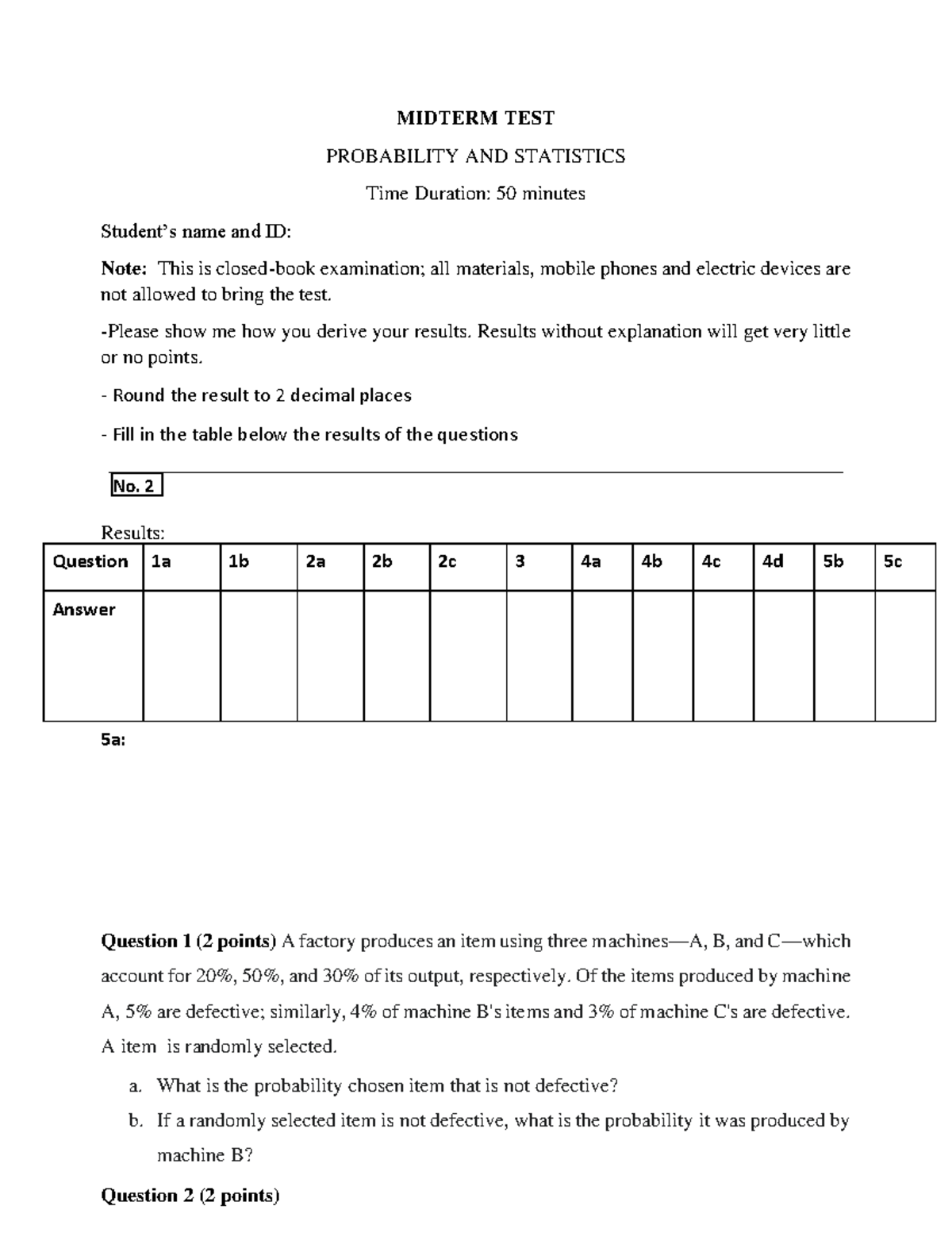 MIDTERM TEST CLC.2 (N02) - PROBABILITY & STATISTICS Overview - Studocu