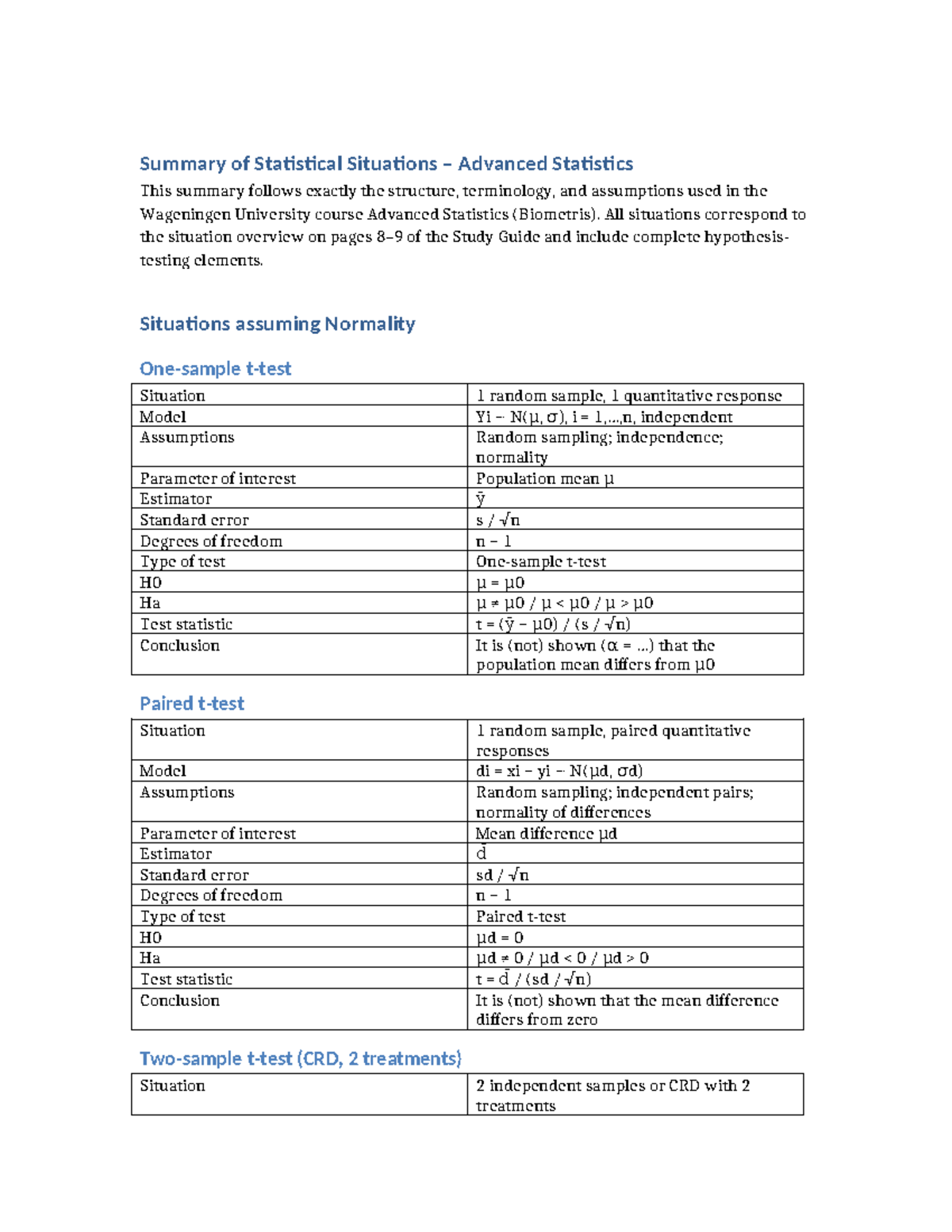 Summary of Statistical Situations for Advanced Statistics (Biometris ...