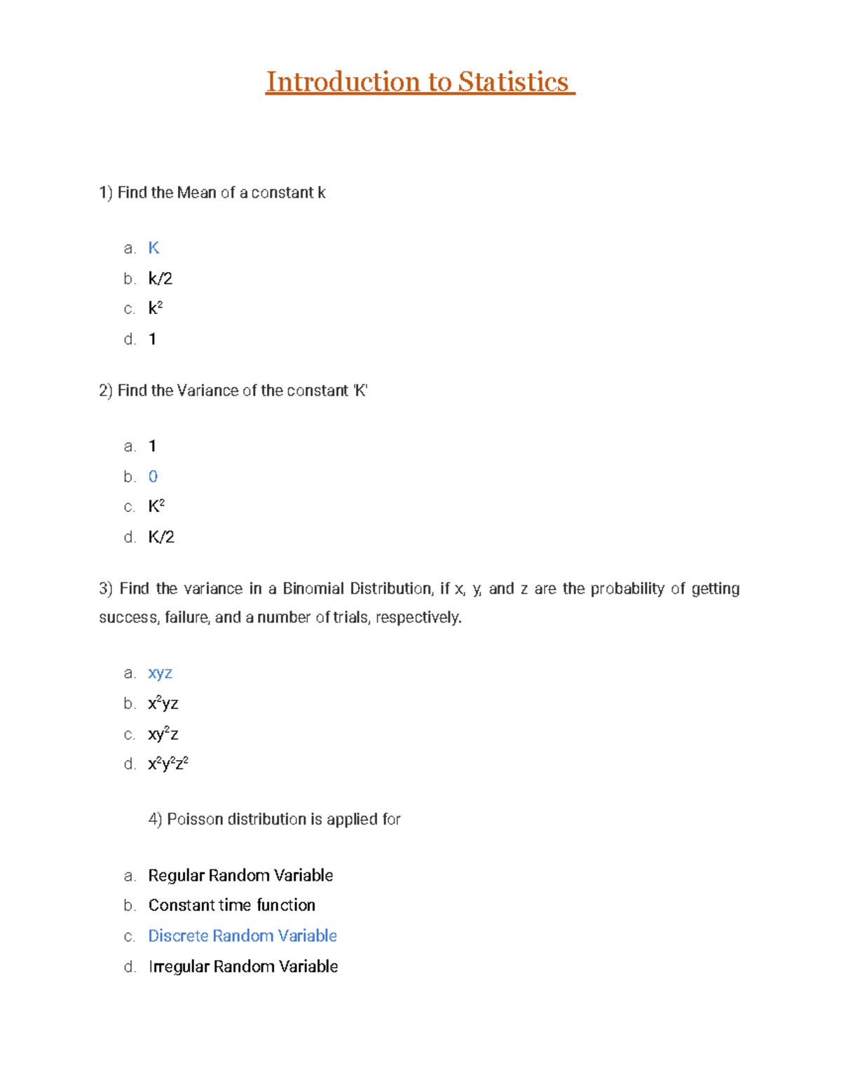 Introduction to Statistics Questions - Introduction to Statistics Find ...