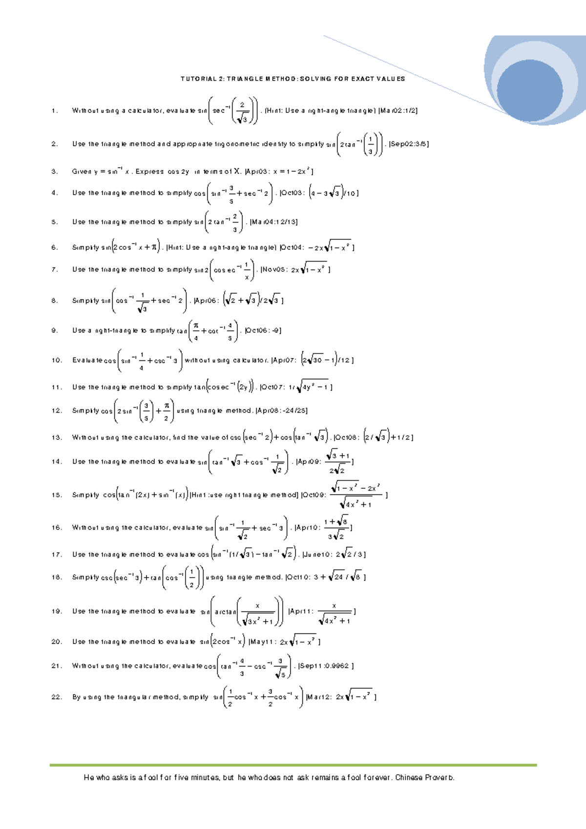 Tutorial 2: Triangle Method for Exact Value Evaluations - Studocu