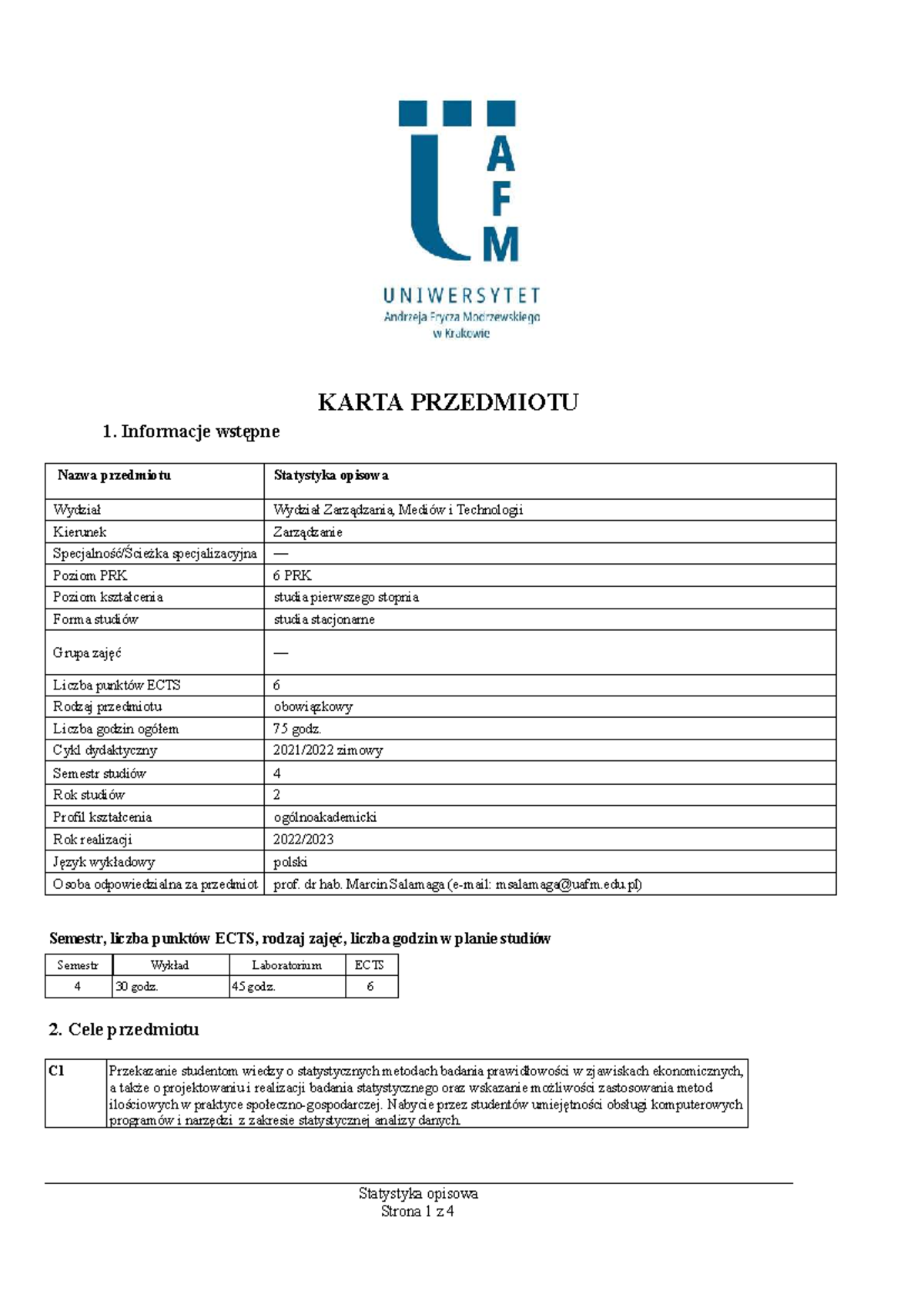 Karta przedmiotu UAFM-2: Statystyka Opisowa - Informacje i Cele - Studocu