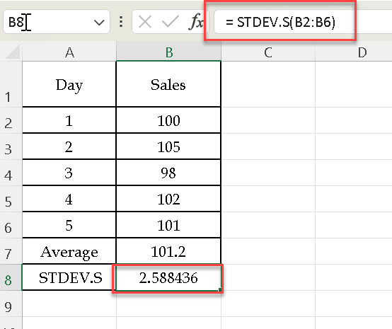 STDEV.S Function - Formual, Example, Sample, Excel