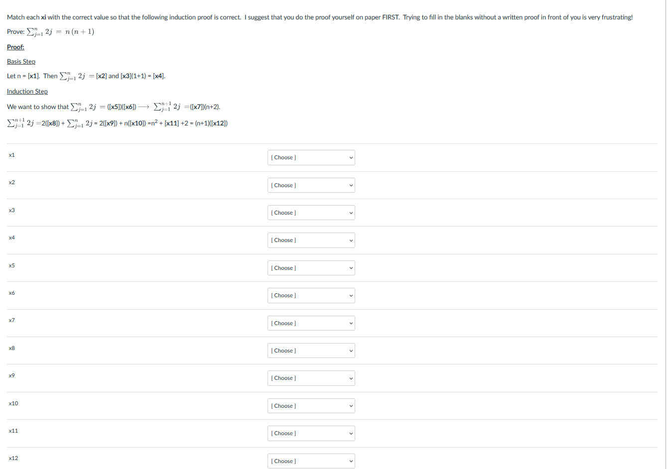 Solved Prove: ∑j=1n2j=n(n+1)Proof:Basis StepLet n=[x1]. | Chegg.com
