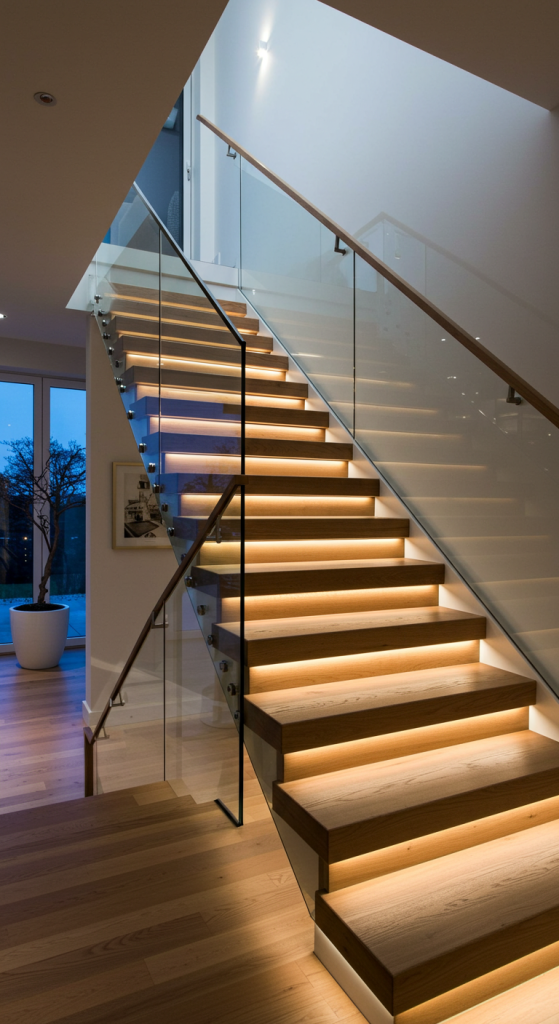 Modern Staircase Design with Glass Railing and Wood Flooring