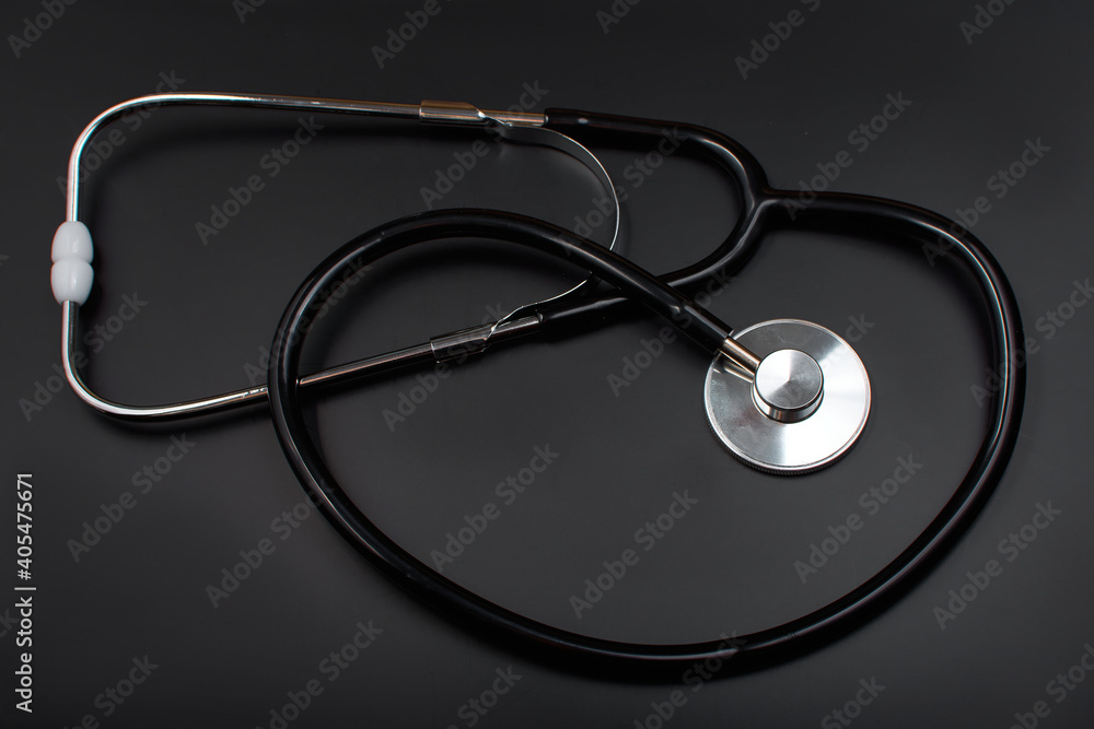 Stethoscope with black rubber tube, over black background. Medical ...
