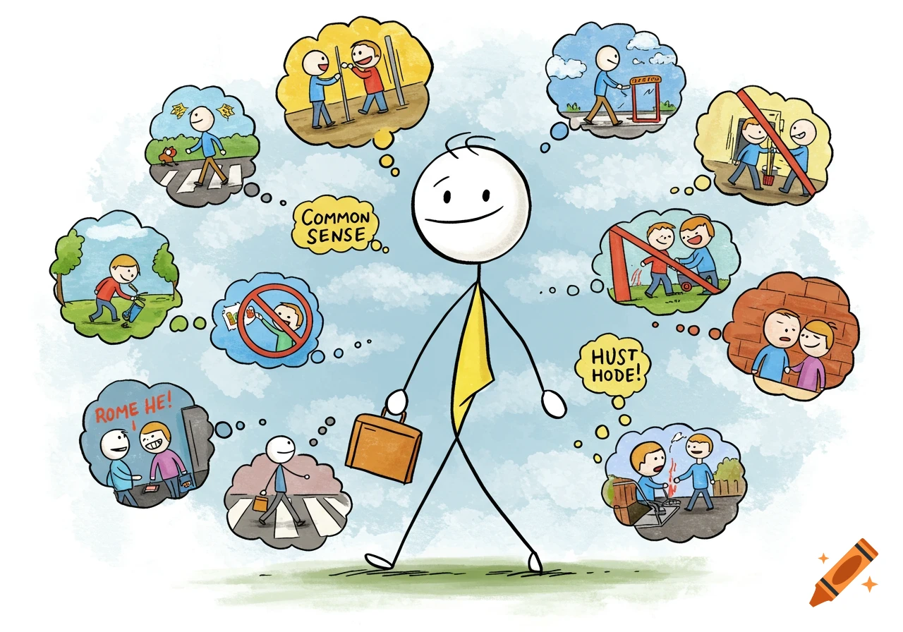 Cartoon illustration of a stick figure surrounded by thought bubbles ...