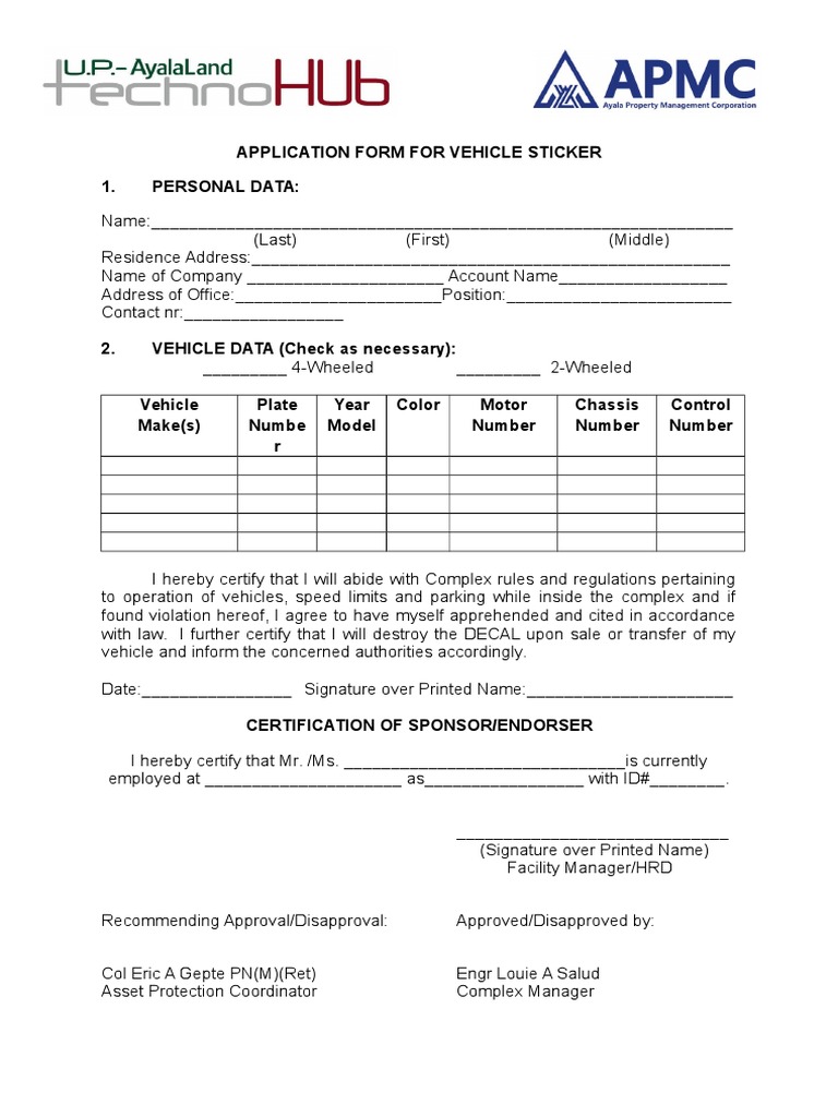Vehicle Sticker Application Form | PDF | Condominium | Corporations