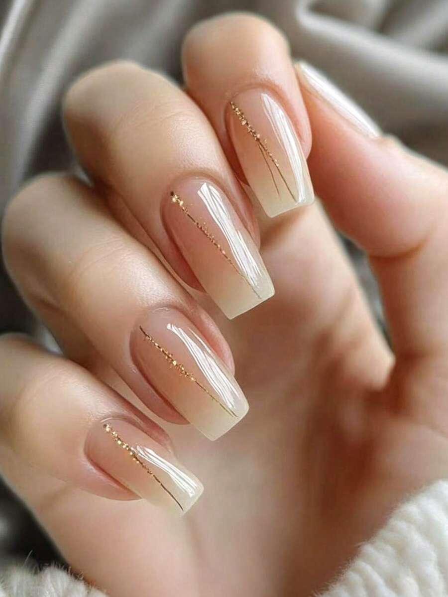 24pcs Short Square Nail Stickers - French Champagne Glitter Glossy Fake ...