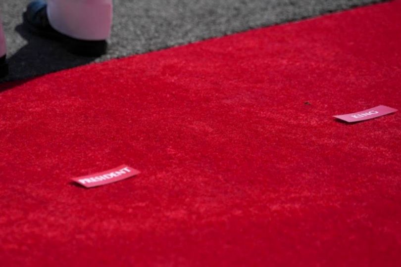 Humiliating sticker tells Trump, 79, where to stand as he meets with ...