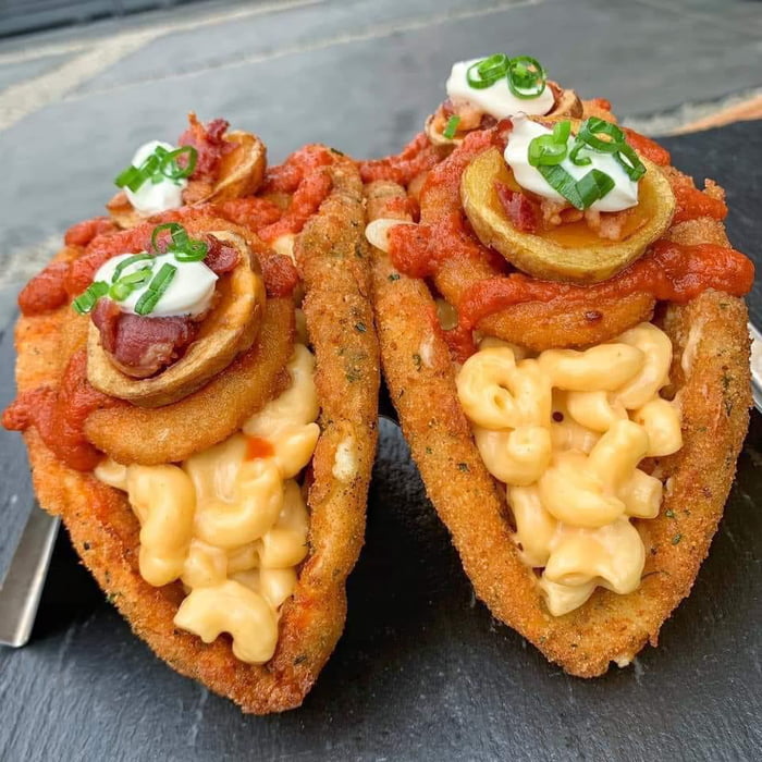 This mozzarella stick shells with mac n cheese, topped with onion rings ...