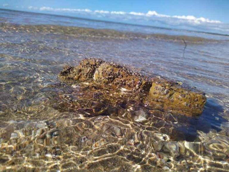 Stranded object rock full of shells mussels stick on it on beach sand ...