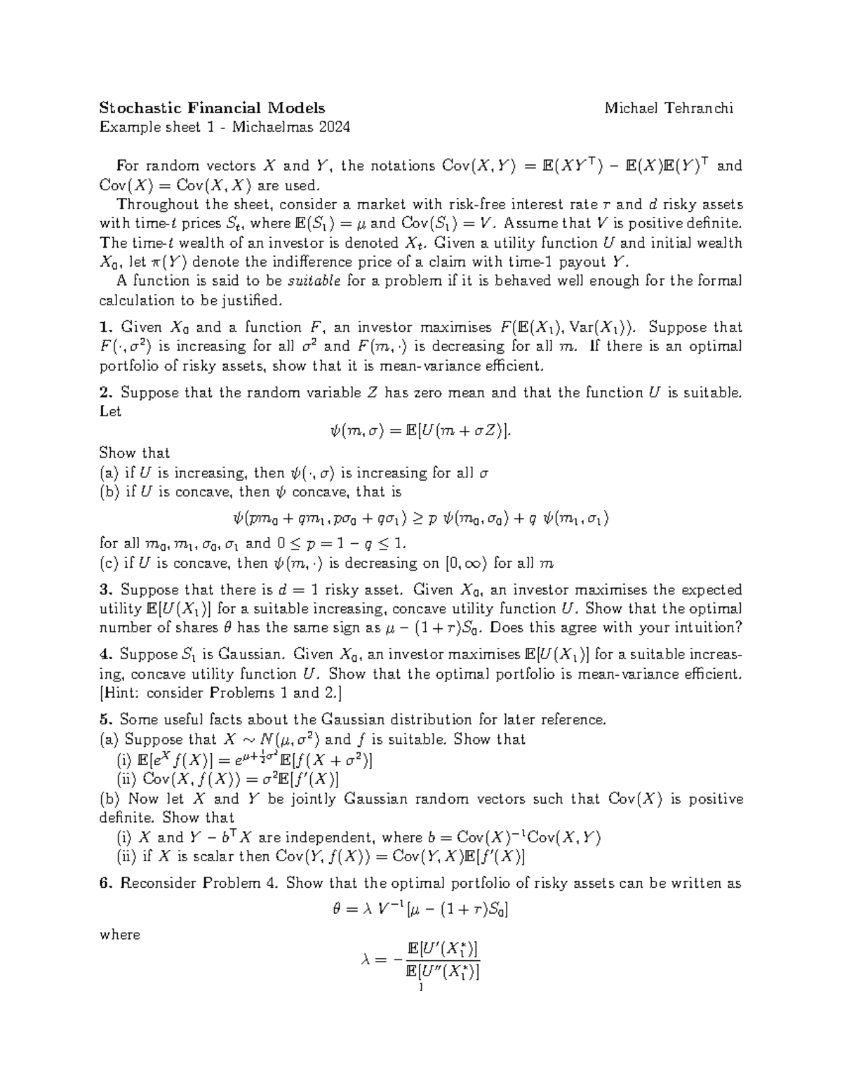 Stochastic Financial Models Example Sheet 1 - Michaelmas 2024 - Studocu
