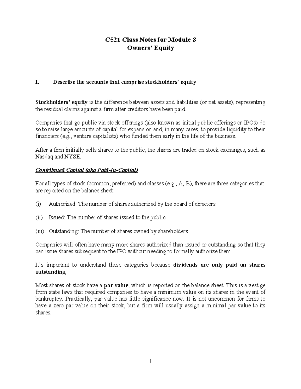 C521 Class Notes: Module 8 - Owners' Equity & Stock Transactions - Studocu