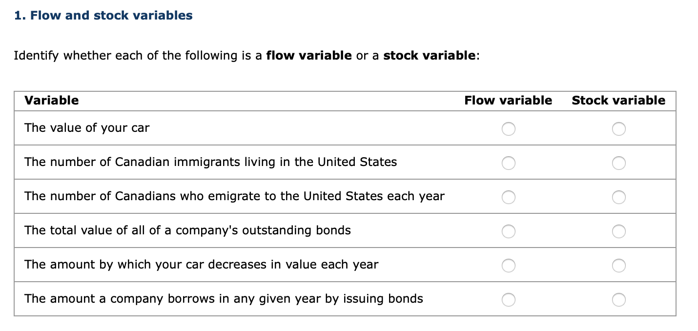 Solved 1. Flow and stock variables In the following table, | Chegg.com