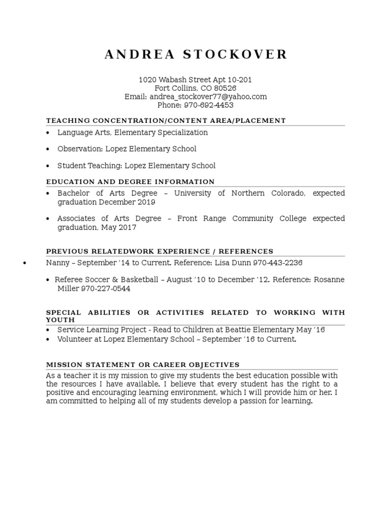 Andrea Stockover: Teaching Concentration/Content Area/Placement | PDF