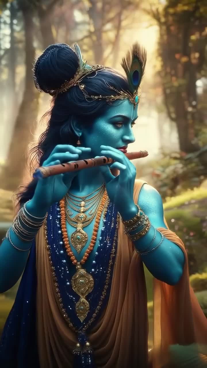 A mystical video scene of a deity playing a flute in a forest, captured ...
