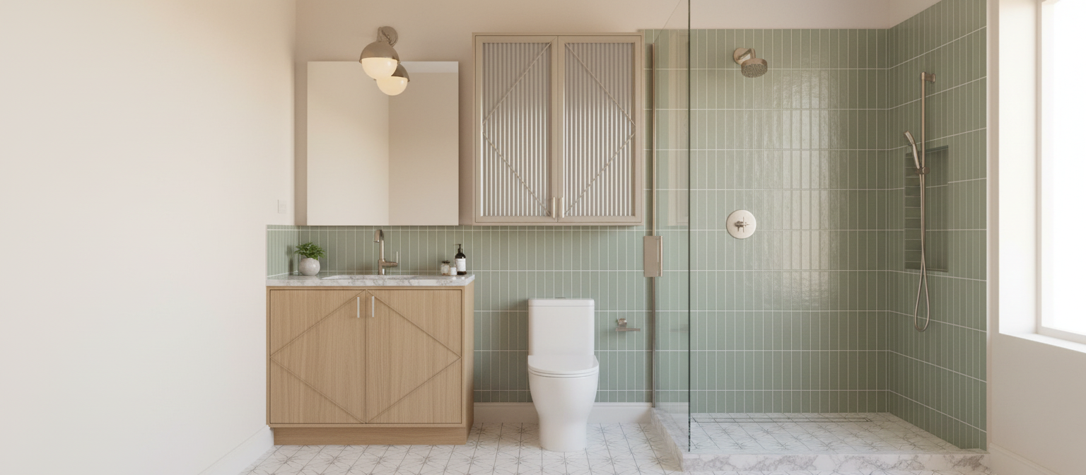 modern scandinavian aesthetic shower has the light green tiles stacked ...
