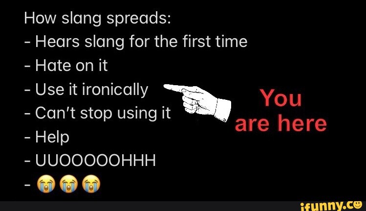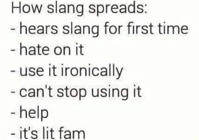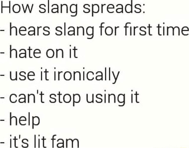 How slang spreads: - hears slang for first time - hate on it - use It ...