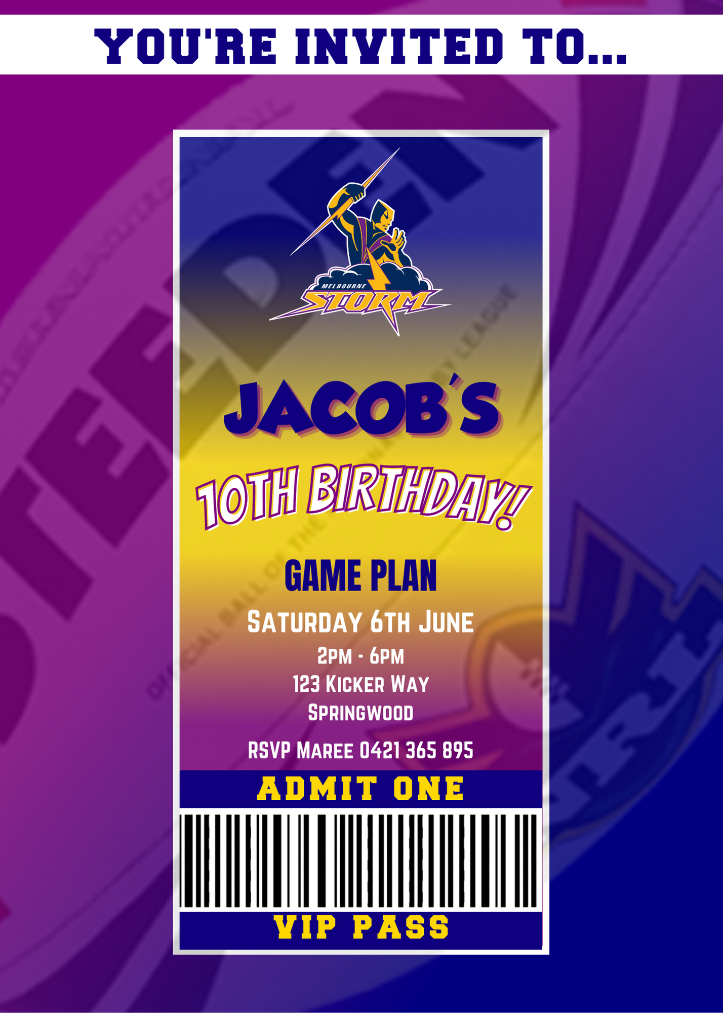 Melbourne Storm VIP Pass Birthday Invitation – Maz Kreations