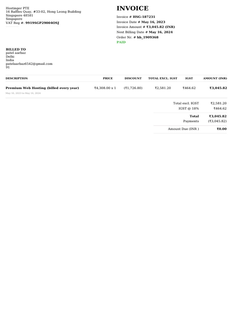 Hostinger Invoice HSG-187231 Details | PDF
