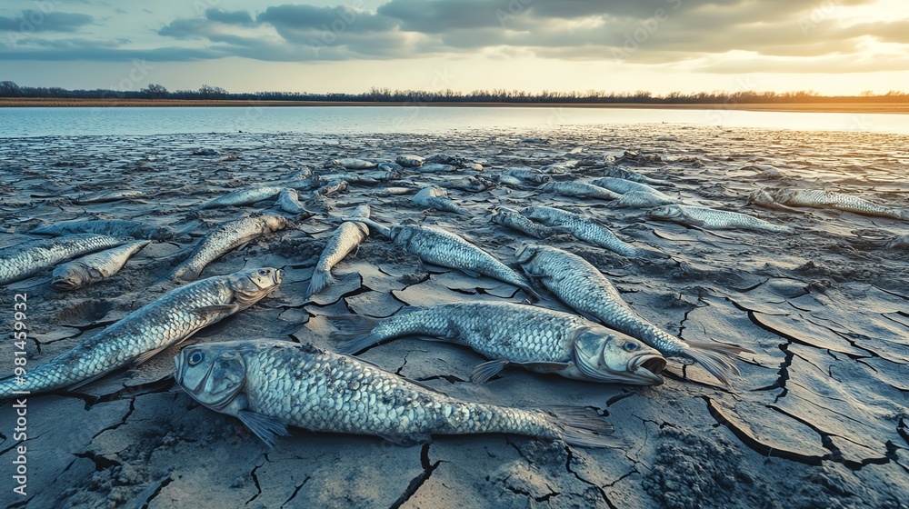 Dried lakebed with stranded fish under a dramatic sunset, highlighting ...