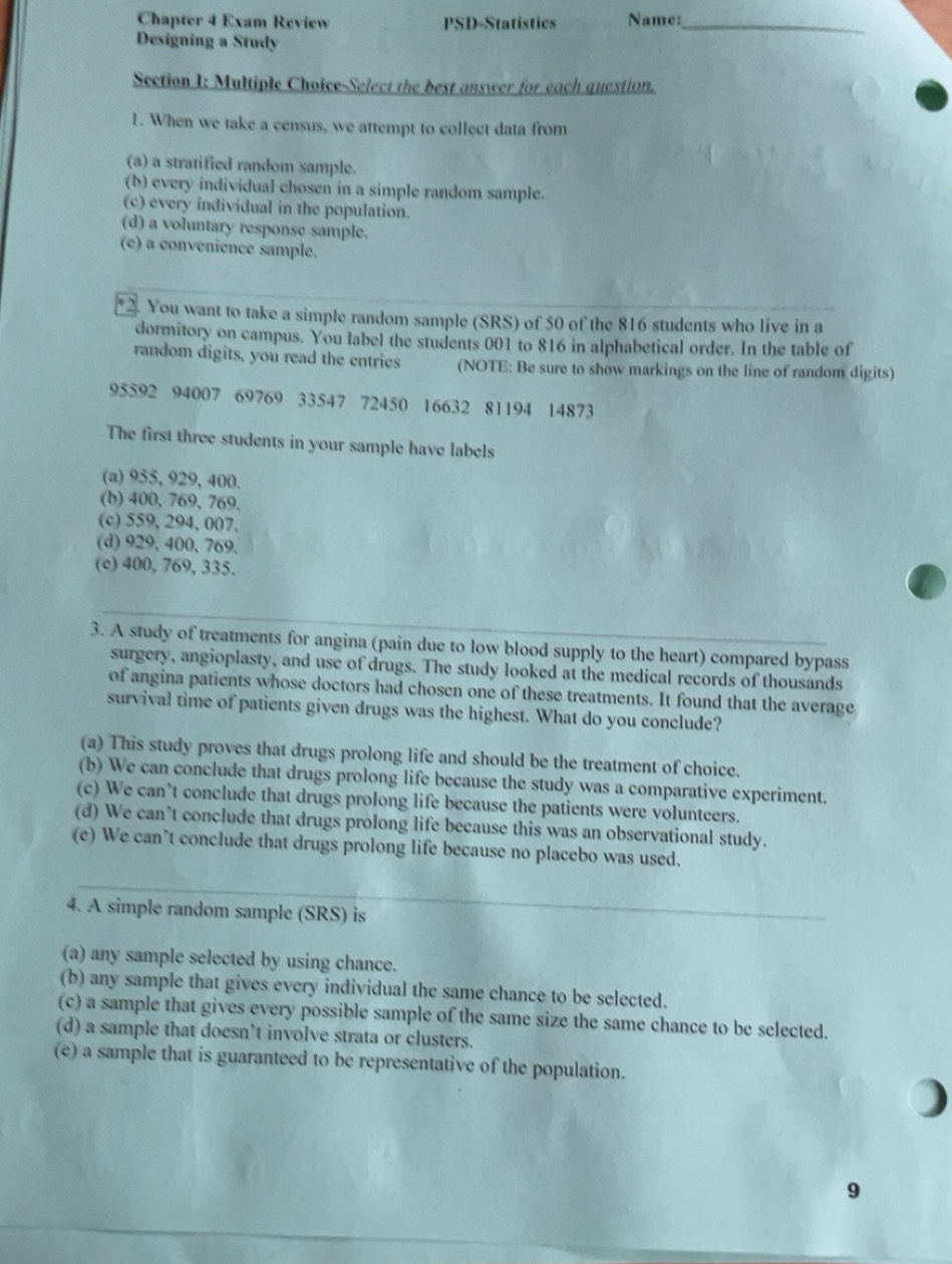 Solved: Chapter 4 Exam Review PSD-Statistics Name:_ Designing a Study ...