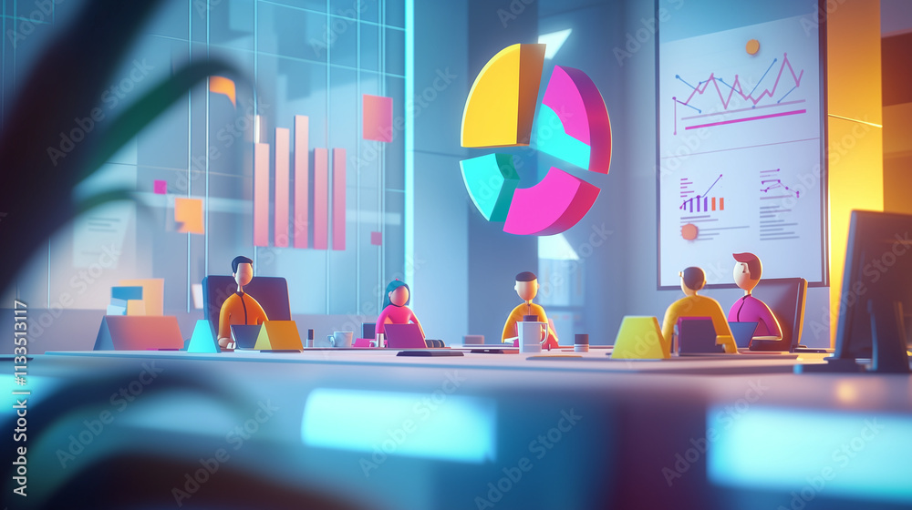 Stylized 3D animation depicts a team meeting around a table, analyzing ...