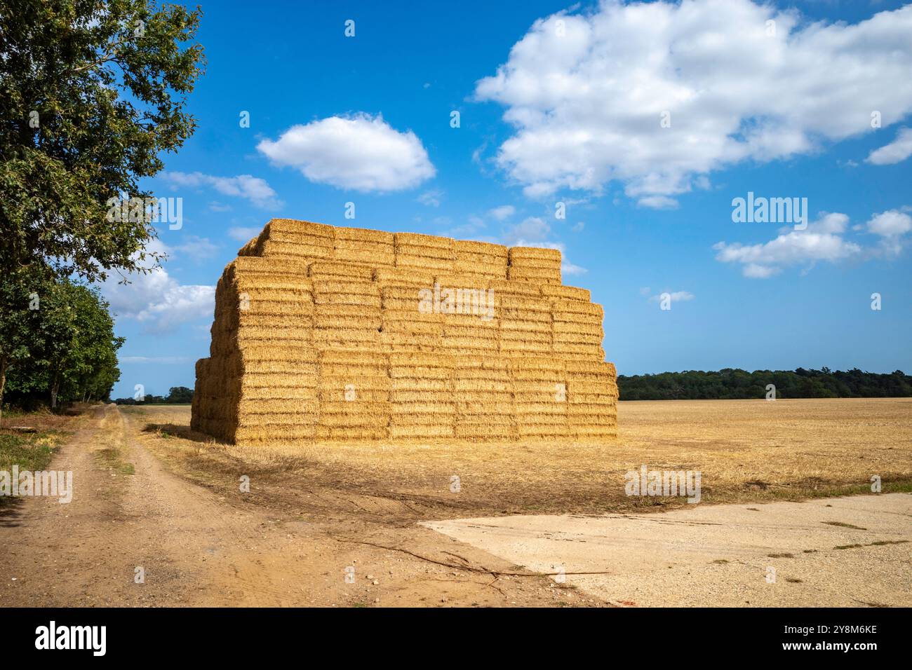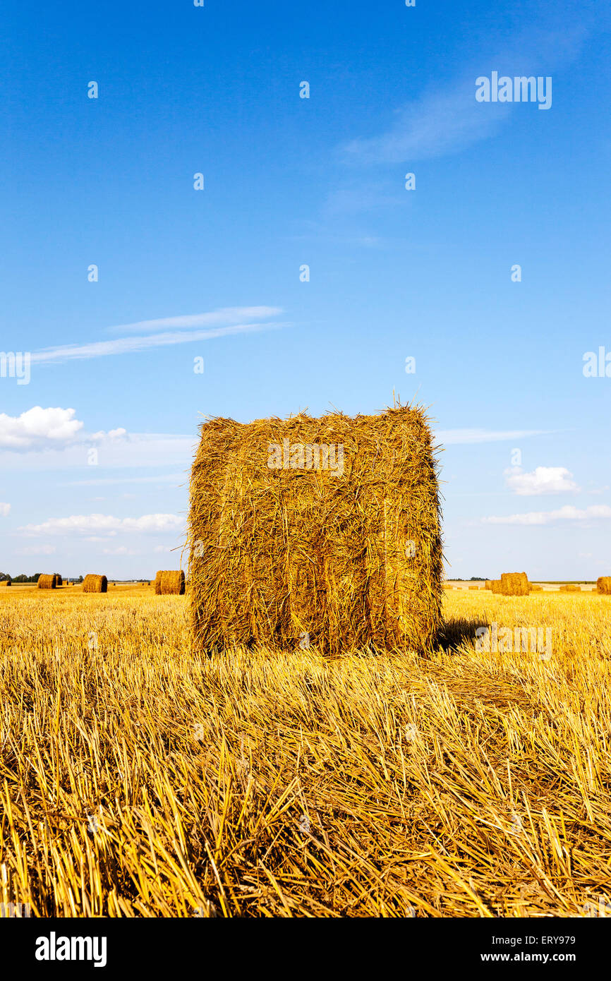 Straw stack on a stubble field in the sunshine Stock Photo - Alamy