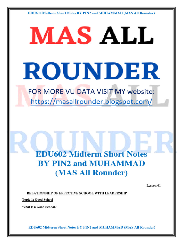 EDU602 Midterm Short Notes by PIN2 and MUHAMMAD (MAS All Rounder) | PDF ...