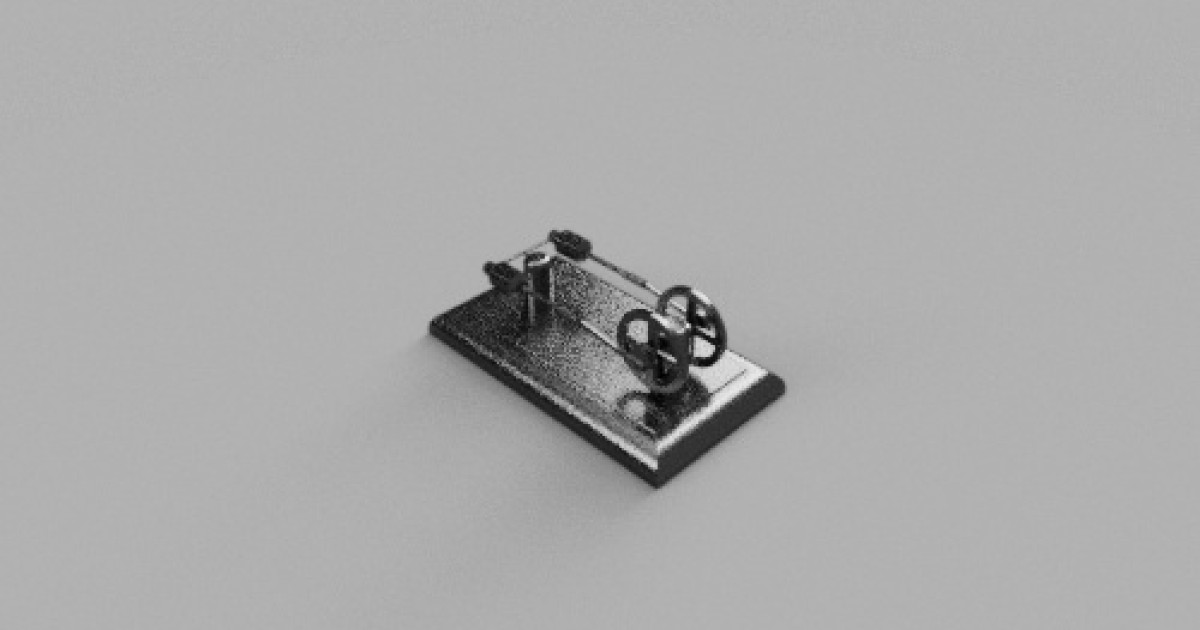 A photorealistic, massive industrial-grade Stirling engine sits on the ...
