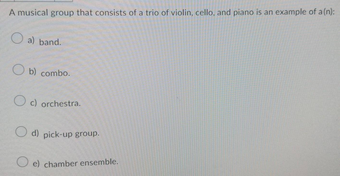 Solved: A musical group that consists of a trio of violin, cello, and ...