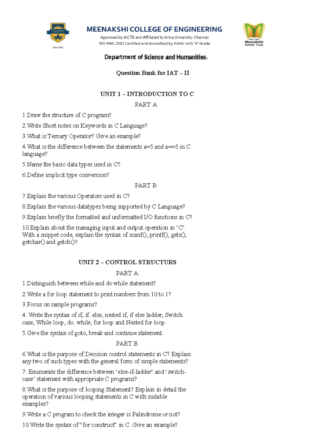 Question Bank for IAT II: C Programming Concepts and Exercises - Studocu
