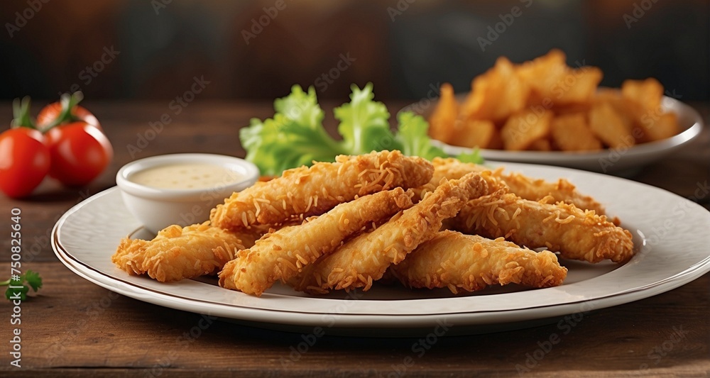 Create an ultra-realistic image of a plate of crispy chicken strips ...